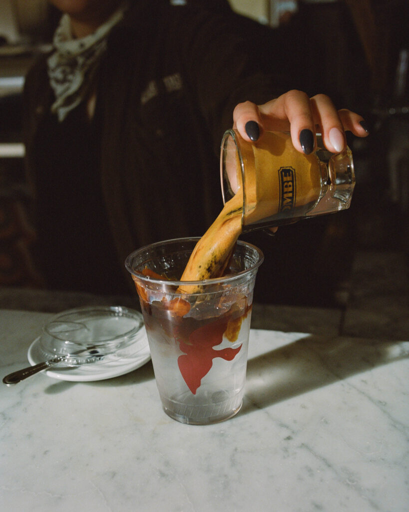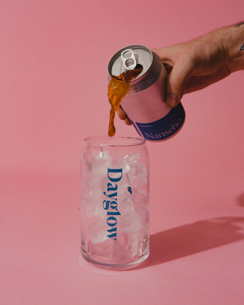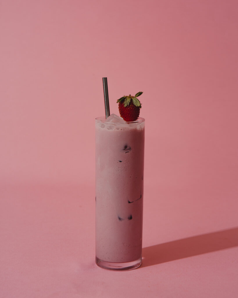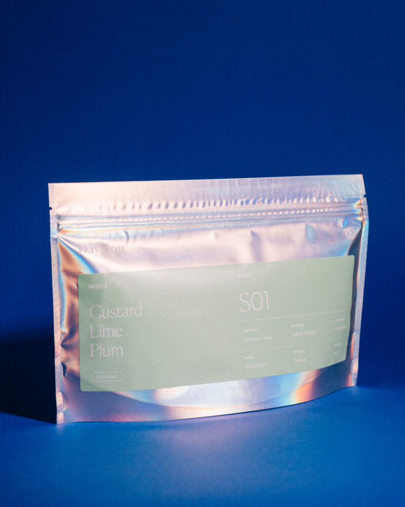 Dayglow’s Instagram grid is a colorful array of product photography. Holographic retail bags, cafe beverages, and pastries stand alone on solid-color backdrops that change with the seasons. Scrolling through, you’ll see the shift in mood from a grid of crisp product photos set on a delicate lavender background to another set on stark, deep cobalt blue. One image depicts a perfect cortado in high definition, slightly overfilled to form a pillowy surface, a single stream of milk dripping down the side of a smoke-tinted Gibraltar glass. The drink floats on a marigold backdrop, yet the shadows keep it anchored in space and time.