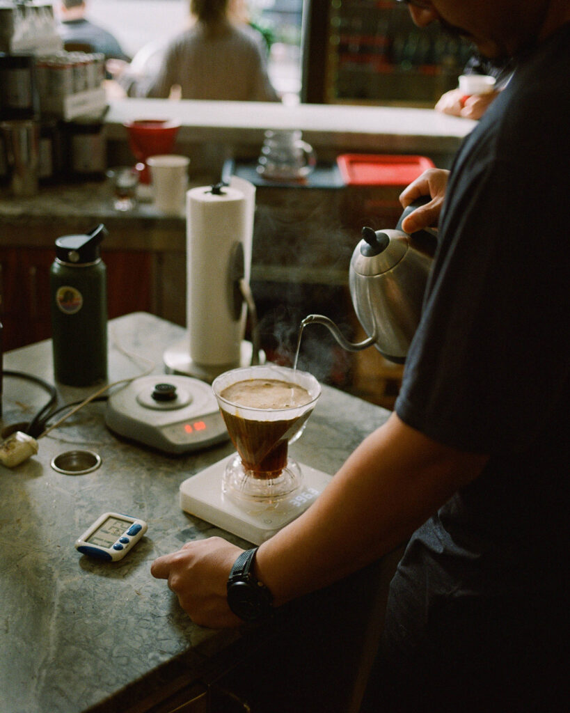 Next, Wright recommends checking for cleanliness and technical accuracy. If he’s photographing a barista preparing a shot, he’ll first wipe away any stray grinds on the counter, be sure the portafilters are rinsed and clean, and only snap a picture of the most level tamping technique.