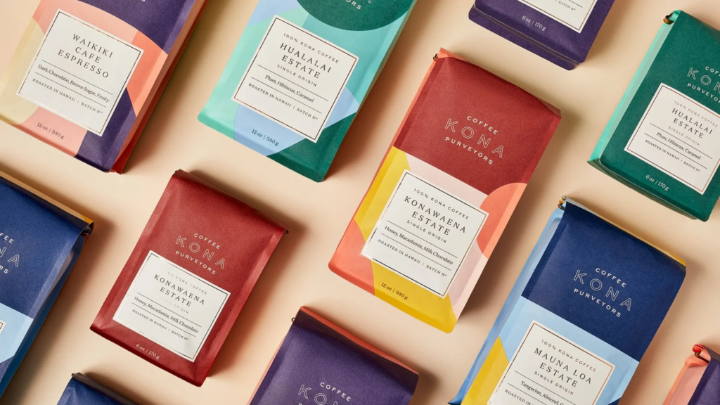 Their coffee bags’ vibrant palettes feature colors sourced from photos of Hawaii’s rich landscapes, including its coastline, volcanoes, and the hues of dawn and dusk.