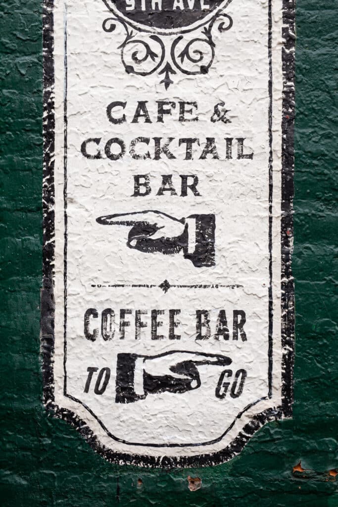 By day, customers could order coffee listed on vintage mirrored menu boards behind the counter. These boards glide along tracks, discreetly covering the liquor shelves in the morning hours. With coffee and cocktail service overlapping, a subtle shift occurs as dusk descends—bartenders slide the menu boards back to unveil an array of spirits while cleverly concealing the coffee shelves.