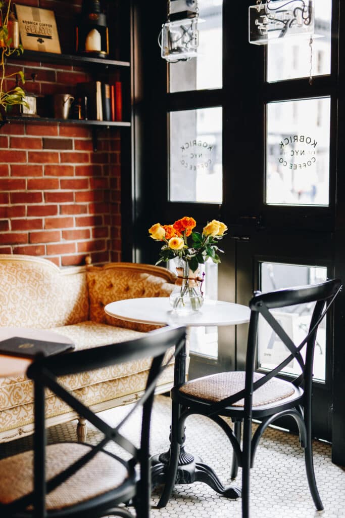 The busy store sits among the cobblestone streets on Manhattan’s west side, with exposed brick walls and tall windows that fill the interior with natural light from dawn to dusk. As the sun sets and evening arrives, the space transforms: pastries are cleared from the bar, the condiment station disappears from sight, and the ambiance shifts as dimmed lights and flickering candles grace the tables. The music becomes more lively and upbeat, setting the stage for the night ahead.