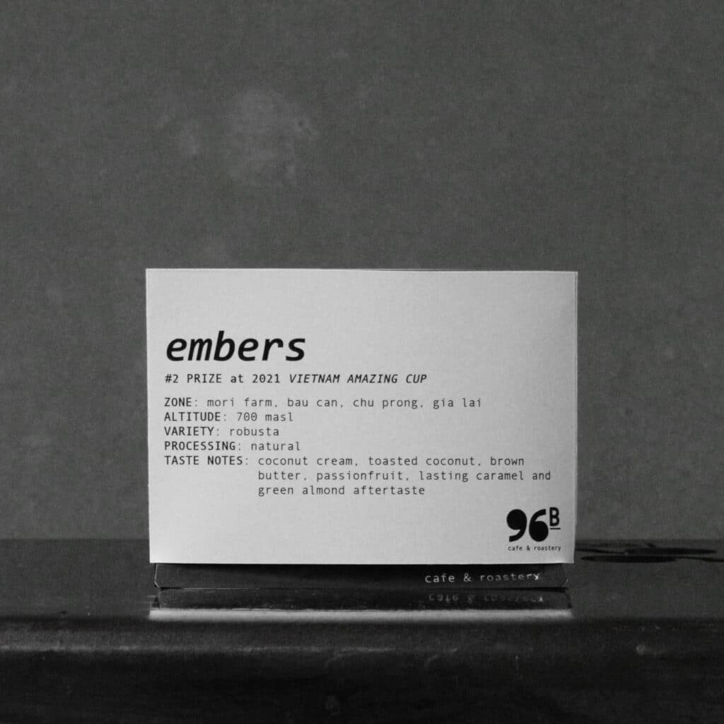 96B has been incorporating Robusta into its espresso blends since opening in 2016. But it wasn’t until 2021 that Choi began releasing Robusta lots as single-origin offerings: “At the time, I did a test roast and cupped the Vietnam Amazing Cup Winner Robusta lot from [Ms. Tran Thi Bich Ngoc of Mori Farm], I had a hunch that now is the right time to showcase Robusta flavor,” she says.