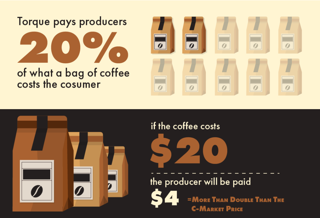 Conceptually, the Proportional Pricing model is straightforward: Torque pays producers 20% of what a bag of coffee costs the consumer. So for every $20 bag of roasted coffee bought, the consumer can rest assured that the producer made $4.