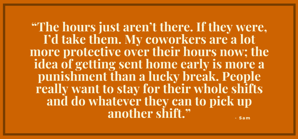 She’s grateful to have had those experiences. Now, she feels “extremely restricted with her cash flow,” partially due to reduced hours in her coffee job. “The hours just aren’t there,” she says. “If they were, I’d take them. My coworkers are a lot more protective over their hours now; the idea of getting sent home early is more a punishment than a lucky break. People really want to stay for their whole shifts and do whatever they can to pick up another shift.” It’s also become common for her coworkers to have second jobs or side gigs.
