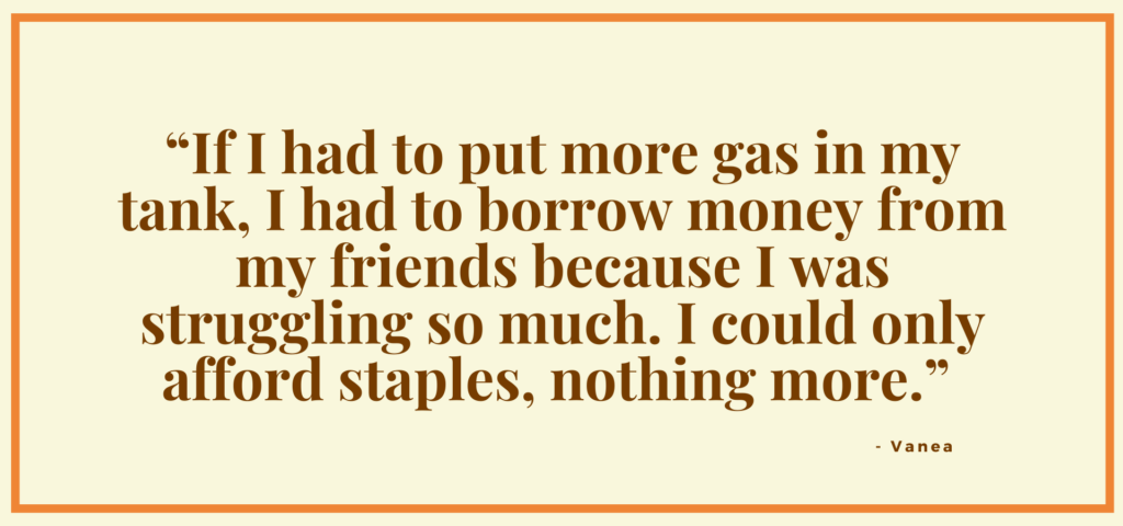 She kept pushing as her expenses increased and her budget shrank, especially for non-fixed essentials like food. “After I paid my rent and put gas in my tank, I would have very little left over,” she says. “If I had to put more gas in my tank, I had to borrow money from my friends because I was struggling so much. I could only afford staples, nothing more.”