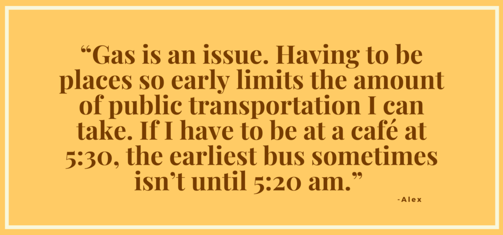 Describing costs, they specifically cite increases in expenses that support work. “Gas is an issue. Having to be places so early limits the amount of public transportation I can take. If I have to be at a café at 5:30, the earliest bus sometimes isn’t until 5:20 am.”
