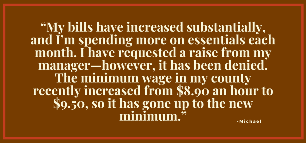 “My wages aren’t meeting my expenses,” says barista Michael*. “My bills have increased substantially, and I’m spending more on essentials each month. I have requested a raise from my manager—however, it has been denied. The minimum wage in my county recently increased from $8.90 an hour to $9.50, so it has gone up to the new minimum.”
