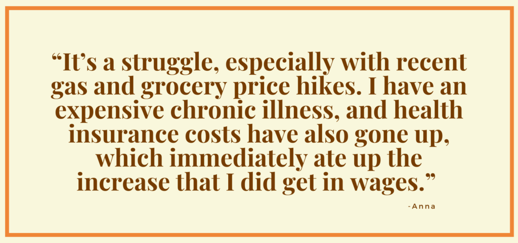 “It’s a struggle, especially with recent gas and grocery price hikes,” says café manager Anna*. “I have an expensive chronic illness, and health insurance costs have also gone up, which immediately ate up the increase that I did get in wages.” Her wages have increased by $1.50 per hour since 2020.