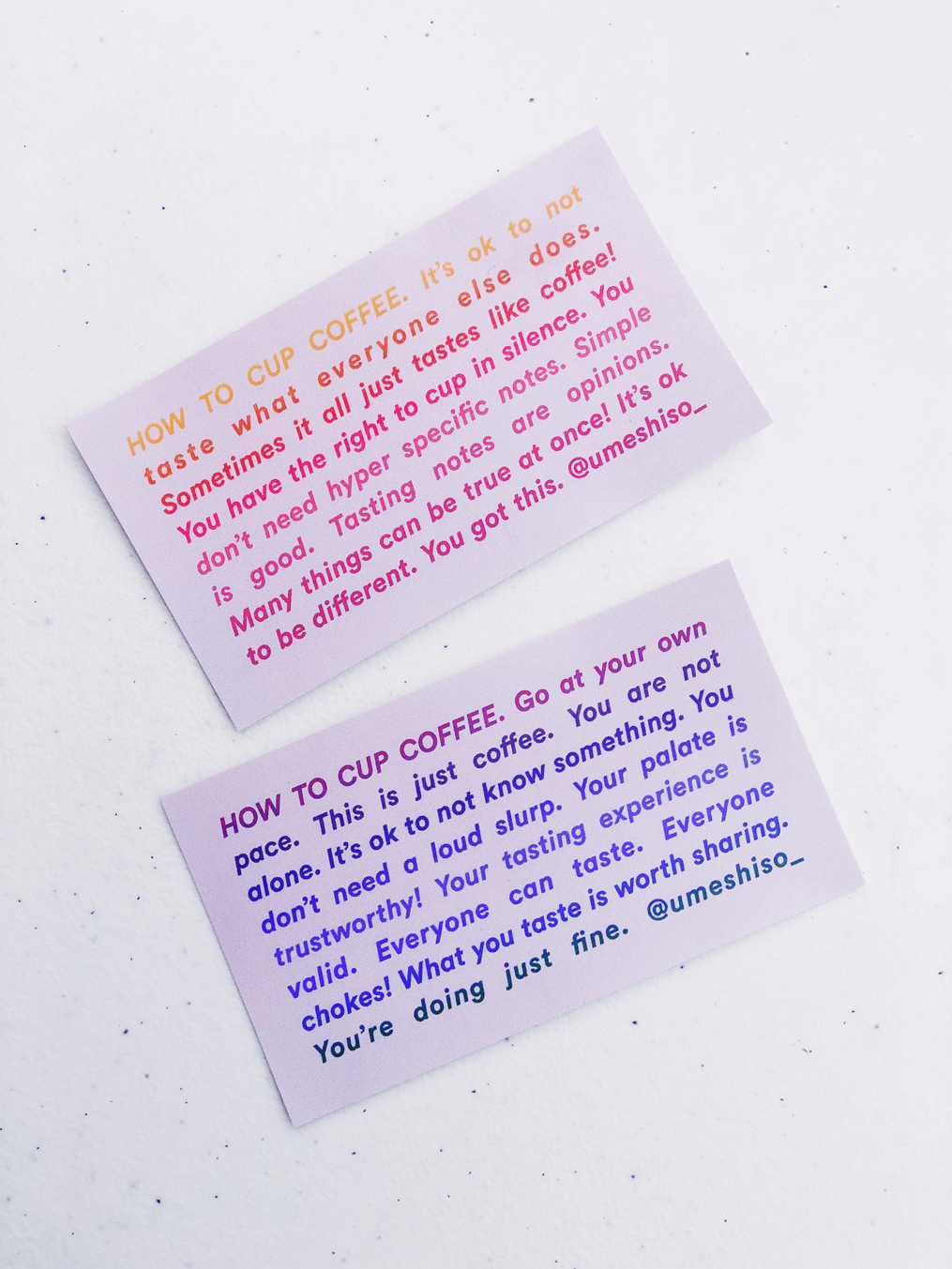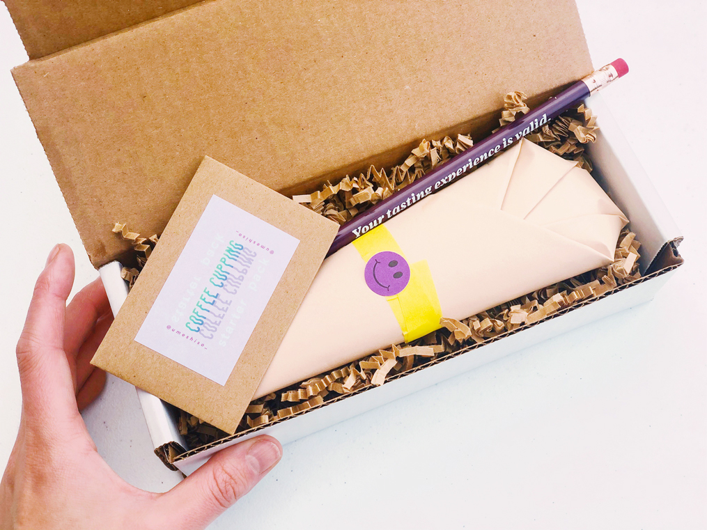 Beyond the spoons, Umeshiso sells stickers with cupping advice, from “it’s just coffee” and “u don’t need a loud slurp” to “tasting notes are opinions.” Another reads, “Go at your own pace. This is just coffee. You are not alone. It’s ok to not know something. You don’t need a loud slurp. Your palate is trustworthy! Your tasting experience is valid. Everyone can taste. Everyone chokes! What you taste is worth sharing. You’re doing just fine.”