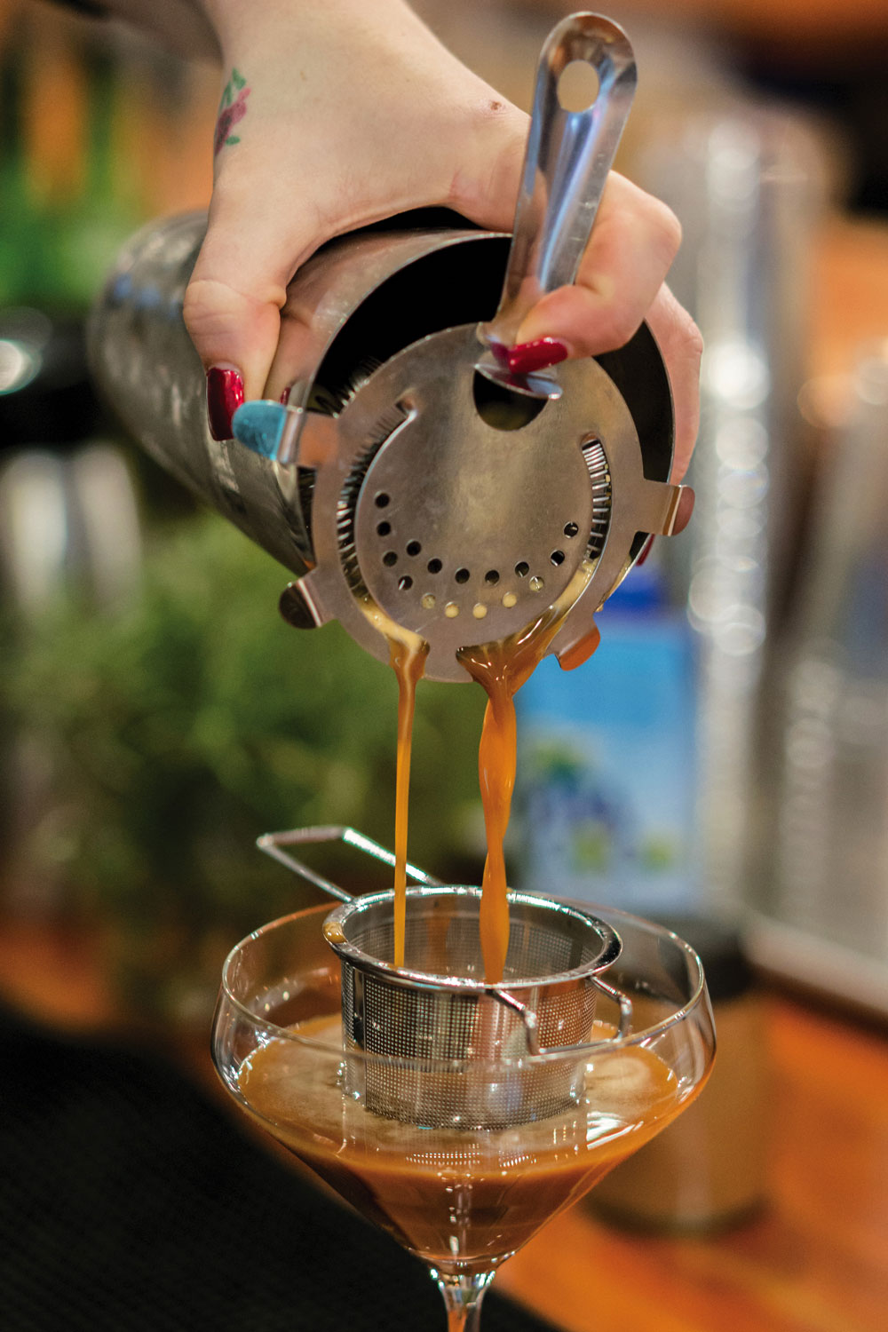 42 & Lawrence makes a drink called the “Redheaded Stranger,” a coffee soda with hibiscus, rosehips, and pomegranate. “It’s about crafting recipes you’re passionate about and doing something creative and amazing that your customers appreciate,” says Swanson. Recently, Ghost Note started working with a local business that makes shrubs, a flavored drinking vinegar. One of their newest drinks, the “Rivercane Tonic,” contains espresso, sweet tea syrup, peach–brown sugar shrub, peach bitters, and tonic water.