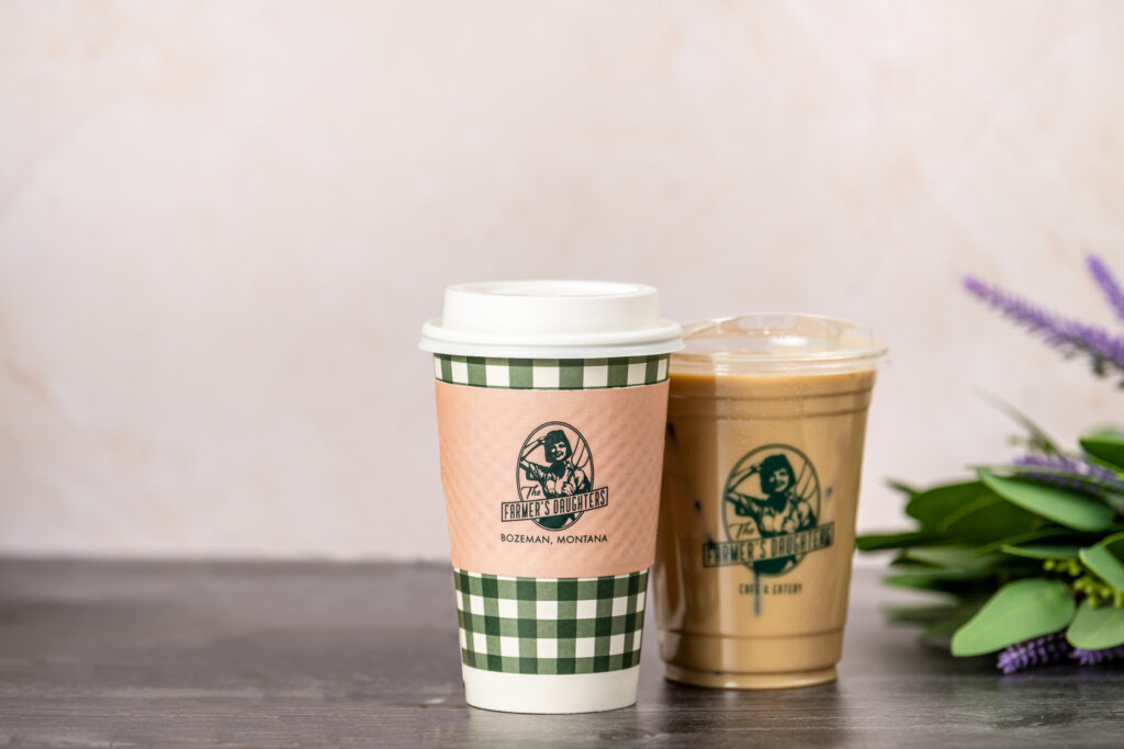 Farmer’s Daughter Cafe is located inside a hotel in Bozeman, Montana. They utilized different design elements between their cold cups and custom single-wall hot cups, along with dimpled coffee sleeves. Farmer’s Daughter Cafe created a visually engaging design using a simple dimpled coffee sleeve by pairing it with an eye-catching pattern on the hot cup.