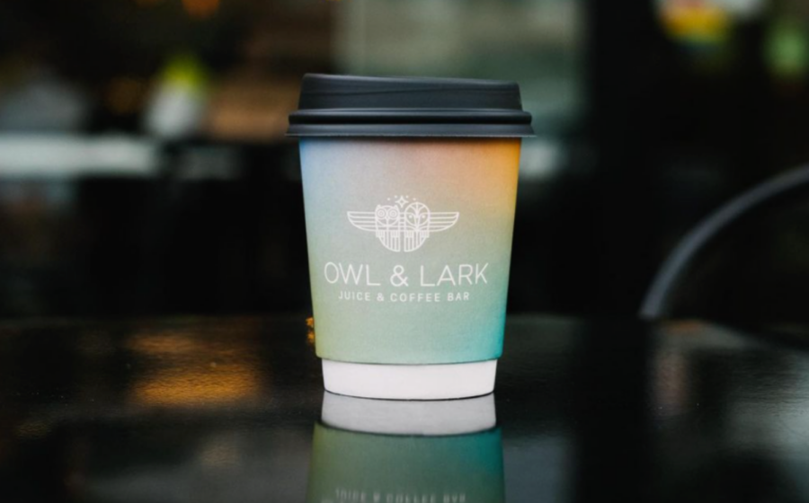 In La Grange, Illinois, Owl & Lark’s mission is to bring wholesome foods, juice, and coffee to their neighborhood. The gradient design of their eight-ounce double-walled paper cup gives the white logo illustration, which would have been lost on a traditional cardboard sleeve, a background to pop.