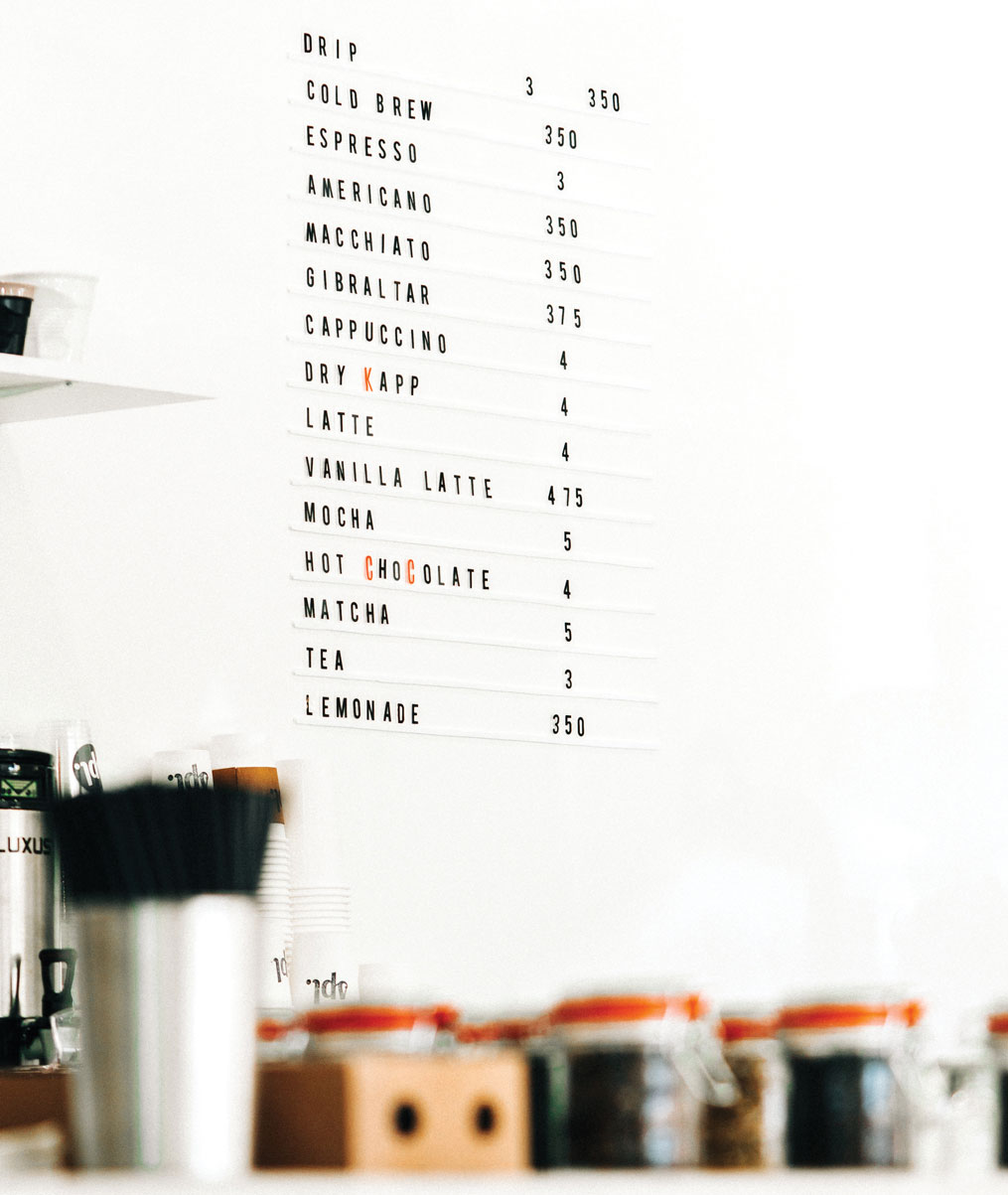 Consider whether you will include origin names next to your brewed coffee offering. Will you promote a selection of flavored syrups to add to lattes? Will you offer food? What kind of food makes sense in your space, that your customers will like, and is on brand?