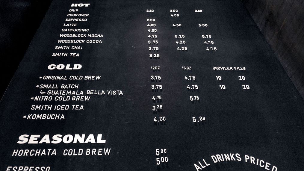 “As [café owners] are still developing their brand identity, it’s really important to figure out who their target customer base is going to be,” advises Joseph Hewitt. Hewitt is a creative technologist and fabricator for Fortitude, a design and manufacturing firm in Portland, Oregon, who redesigned Stumptown’s menus in 2018. “That can be very different depending on where the café is or the personal style of the person opening it. You don’t want to get sick of something you’re going to be in and around every day.”