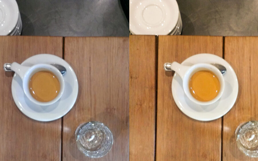 In photography, temperature refers to the length of the waves of light hitting the camera’s sensor. Back in film days, film designed for sunlight would turn your shot sickly yellow-orange under tungsten lights and puke blue-green under fluorescents. That was bad enough when taking a photo of a person. The wrong temperature can render foam a fungal-green. Even junky phone cameras are smart enough to adjust to a decent temperature, so this family-photo-ruining problem happens rarely. But I’ve found that cafés can fool the sensor, especially at the bar.