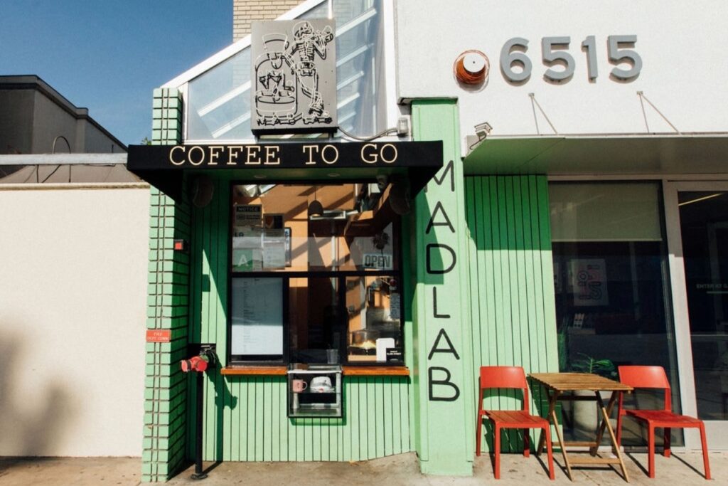 The small footprint encourages focus: Mad Lab doesn’t serve food, the menu is short, and everything is to go. Some might think that the lack of “amenities” would discourage people from coming, but Sinclair has found the opposite. “People will get coffee and sit down on Sunset Boulevard, just criss-cross applesauce,” he says fondly.