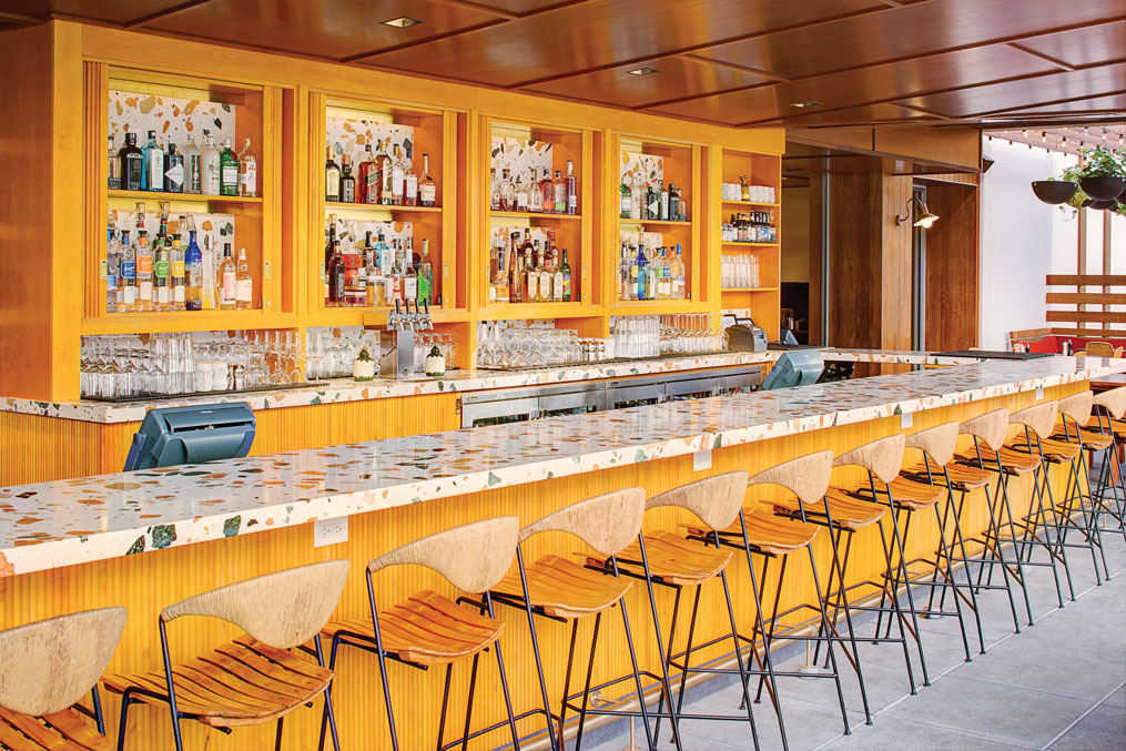 The Hideout, a rooftop bar and café that embraces mid-century modern design, is located in The Laylow, a Marriott Autograph Collection property, on Waikiki Beach. Stumptown Coffee Roasters beans are crafted into coffee and espresso drinks, while more-than-muffins breakfast options include eggs benedict with Kauai prawns. Bright décor includes patterned floor tile, orange and white metal chairs on the sunny patio, and plenty of greenery.