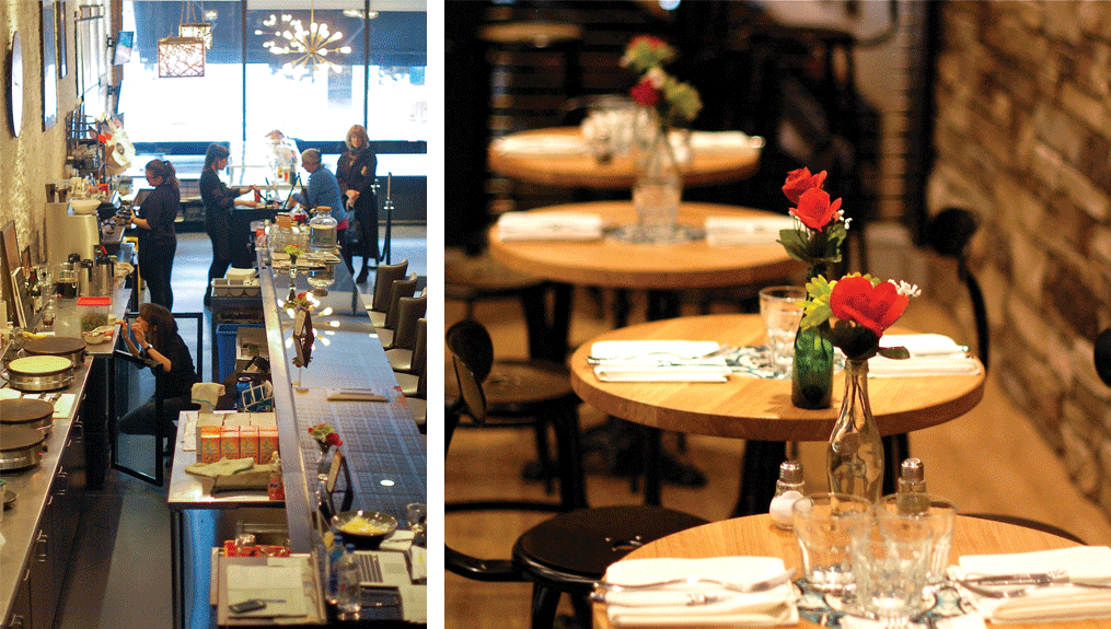 “You can have a crepe, a pastry, and good coffee and tea, then come back at a different time of day and experience something completely different,” says Navarre. The bar is stocked with wine, cheese, and charcuterie, all imported from France.