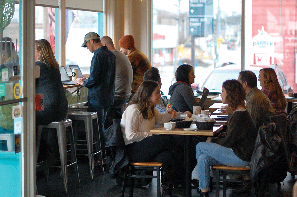 Soft light illuminates the aged brick walls, filling the café with a warm glow. The space is intimate, which allows for something unique to the café industry: a bond with customers.