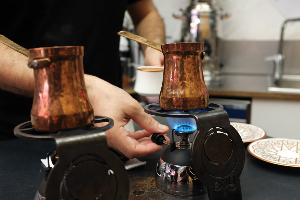 The barista at Coffee Manifesto in Istanbul’s Kadıköy district measures out a small dose of coffee and turns the dial on the Mahlkönig EK-43 clockwise, almost as fine as the grinder goes. In seconds, the coffee is ground into a fine dust and is carefully shaken into a small copper pot with a long handle. The grounds are mixed with tepid water and given a quick stir with a small wooden paddle.