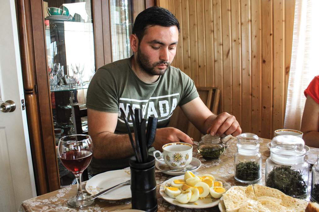 After Gabriel concluded his farm tour, including fermentation, drying racks, packaging, and sorting, we went back to the family home to taste tea—but as this is Georgia, there is no such thing as a small tasting. While we were on our tour of the grounds, Gabriel’s wife had been busy setting up the table with snacks of their homemade cheese, eggs, dried fruit, fruit leather, and chocolates. Davit met us at the home, and I finally had the opportunity to talk with him about his long history with tea and his vision for the future. While tasting the white, green, and black tea, Davit told me his story.