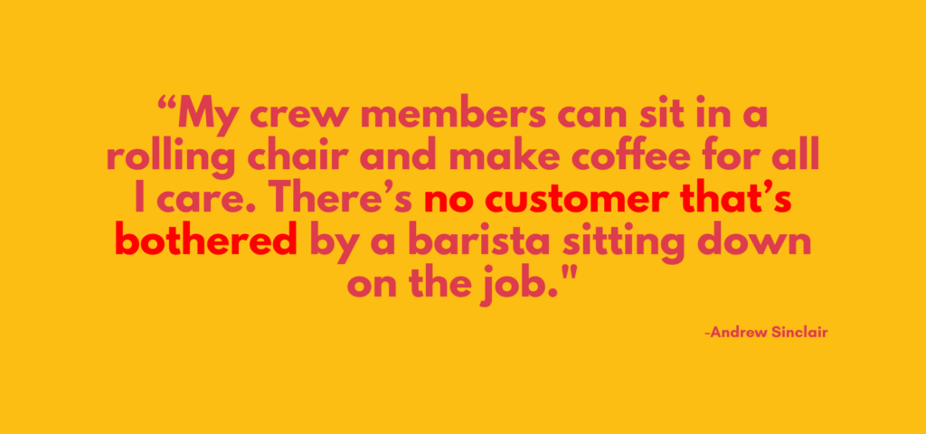 “My crew members can sit in a rolling chair and make coffee for all I care,” he says. “There’s no customer that’s bothered by a barista sitting down on the job. If they are? Fuck ’em.”