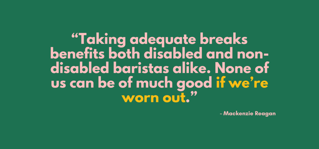 “Taking adequate breaks benefits both disabled and non-disabled baristas alike. None of us can be of much good if we’re worn out,” says Mackenzie Reagan, who spent four years as a barista, first at Starbucks, then at an independent shop.