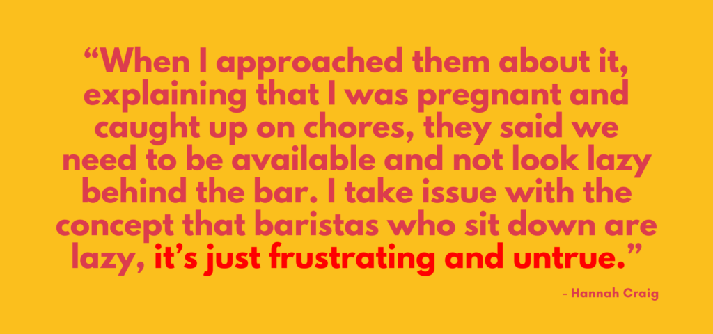 While pregnant, she worked for a company that removed her chair without explanation. “When I approached them about it, explaining that I was pregnant and caught up on chores, they said we need to be available and not look lazy behind the bar,” she says. “I take issue with the concept that baristas who sit down are lazy, it’s just frustrating and untrue.”