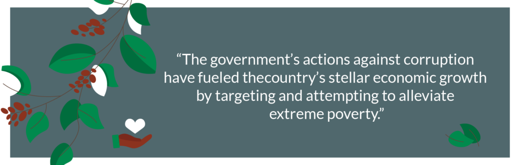 The government’s actions against corruption have fueled the country’s stellar economic growth by targeting and attempting to alleviate extreme poverty. Countrywide reconciliation was a big part of this: the government worked to improve the livelihoods of both perpetrators and victims of the genocide to break the cycle of retribution that befalls many conflict zones.