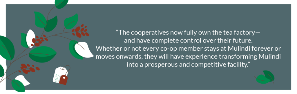 It was always the plan for the Wood Foundation to relinquish its stake in the factory and hand over ownership to local farmer cooperatives. After recouping their investments, the foundations left operations to the Cooperative du Thé Mulindi (COOPTHE) and Cooperative du Thé Villageois Mulindi (COOTHEVM). The cooperatives now fully own the tea factory—and have complete control over their future. Whether or not every co-op member stays at Mulindi forever or moves onwards, they will have experience transforming Mulindi into a prosperous and competitive facility.