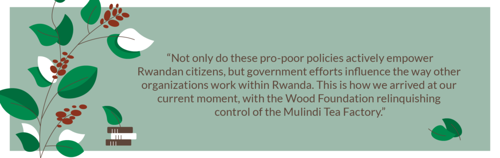 Not only do these pro-poor policies actively empower Rwandan citizens, but government efforts influence the way other organizations work within Rwanda. This is how we arrived at our current moment, with the Wood Foundation relinquishing control of the Mulindi Tea Factory.