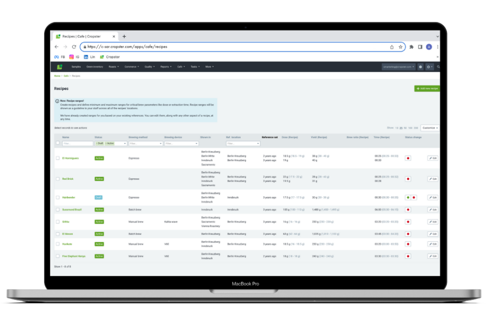 Cropster Cafe eliminates the need for checklists or post-it reminders cluttering the bar, allowing managers to make real-time updates to brewing recipes that their entire team will see immediately. Godinho says quality and consistency are cornerstones of their cafe and roastery, and data-rich tools like Cropster are instrumental in achieving this. “Not only does it give us insight into potential quality deviations during operation, but with real-time data, remotely accessible, it helps us identify potentially dire inconsistencies that need to be promptly addressed,” he says.