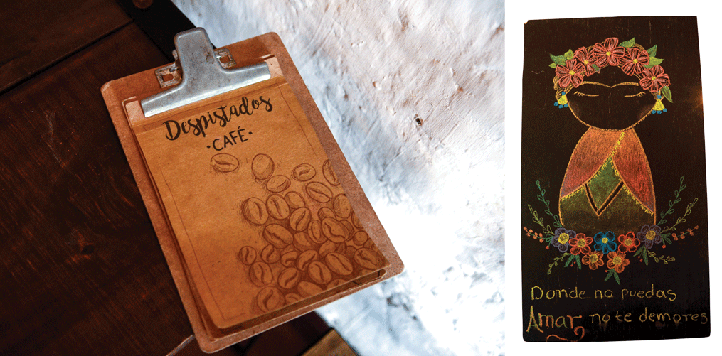 [A]t first glance, the small white adobe building could just be any old residence. Above the entryway, the word “CAFÉ” is small and unimposing, while in curved letters, the name “Despistados” is almost covered with the picturesque vines that creep just below the wavy tin roof. On the ironwork on the wooden door is a small sign with a drawing of a coffee cup that says abierto—“open.”