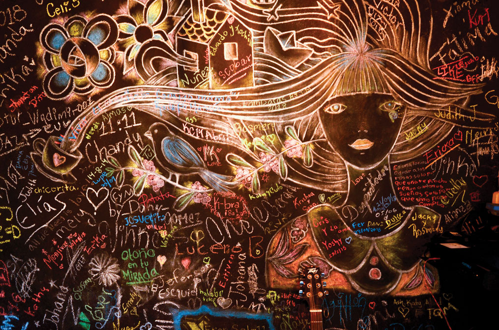 Despistados is a café located in La Palma, El Salvador, a small artsy town just a few minutes’ drive from the Honduran border. Inside, it is warm and cozy, with fewer than 10 tables, plus a small lounge in the back with a couch, a guitar, and a large chalk mural on a black wall where customers can sign their names and write messages. Most of the furniture is made of wood, while the floors are made of local stone.