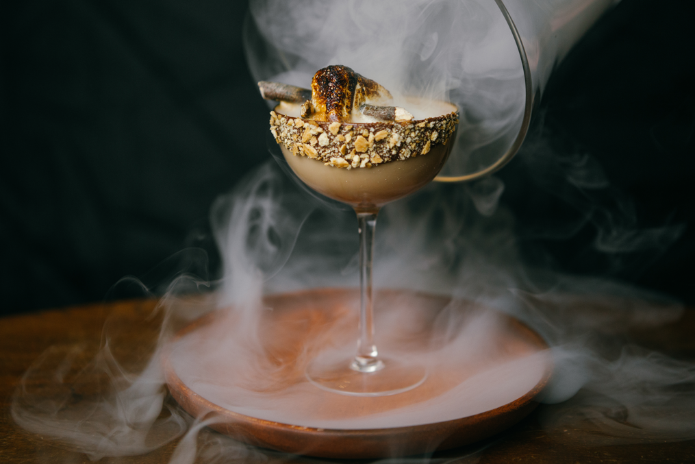 Running at $13 a drink, and only available in store, the specialty latte begins with graham cracker-infused milk and espresso poured into a cocktail glass rimmed with dark chocolate and crumbled graham crackers. The drink then goes under a bell jar with a hose attached to a container of hickory chips, which are burned to pump smoke into the jar. As a final touch, the drink is garnished with a torched house-made salted caramel marshmallow on a stick.