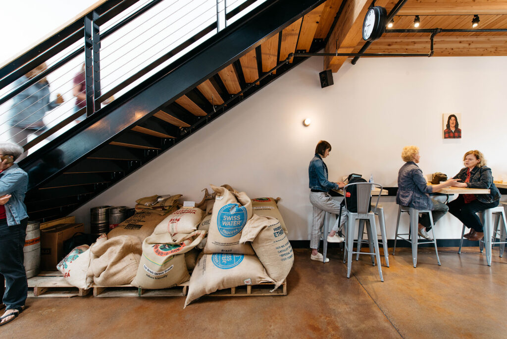 At first glance, Guilder may seem like any other coffee shop. When guests enter the cafe in the Alameda-Irvington neighborhood in northeast Portland, they’ll likely first notice the abundant natural light. Green vines cascade over the white subway tile wall behind the counter—a modern bar designed with patterned pink, gray, and cream tiles. To the left, a mural of a towering 7-foot giant extends its arm outward, seemingly poised to embrace anyone standing before it.