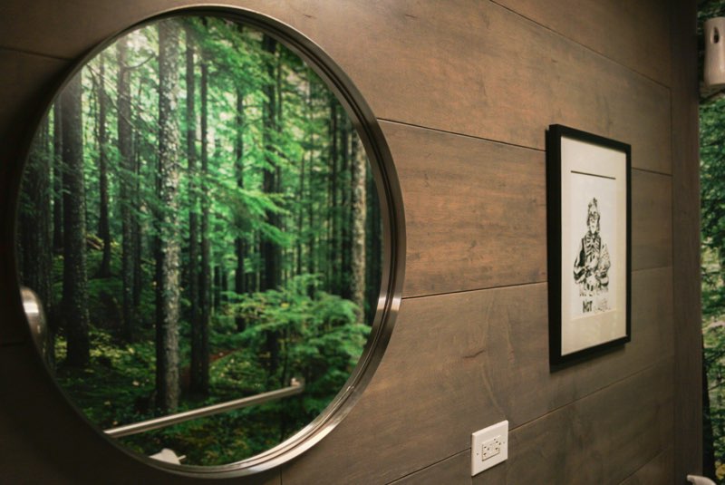 Miller found black and white chevron wallpaper, which he used behind the bar to pay homage to the show’s iconic chevron vinyl flooring in the Red Room. Additionally, guests using the restroom at Damn Fine will notice wallpaper featuring national parks in the Pacific Northwest: another nod to the fictional setting of “Twin Peaks.” “We put that up in the bathroom and hallway,” Miller says. However, if you’ve never seen the show, these references go largely unnoticed.
